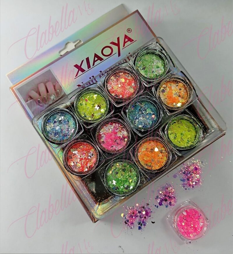 Decoración AZUCAR NEON CON FLAKE Y FIGURAS MIXTAS para uñas 12 piezas de 1/8 por estuche, (Con estuche) surtido (PB)