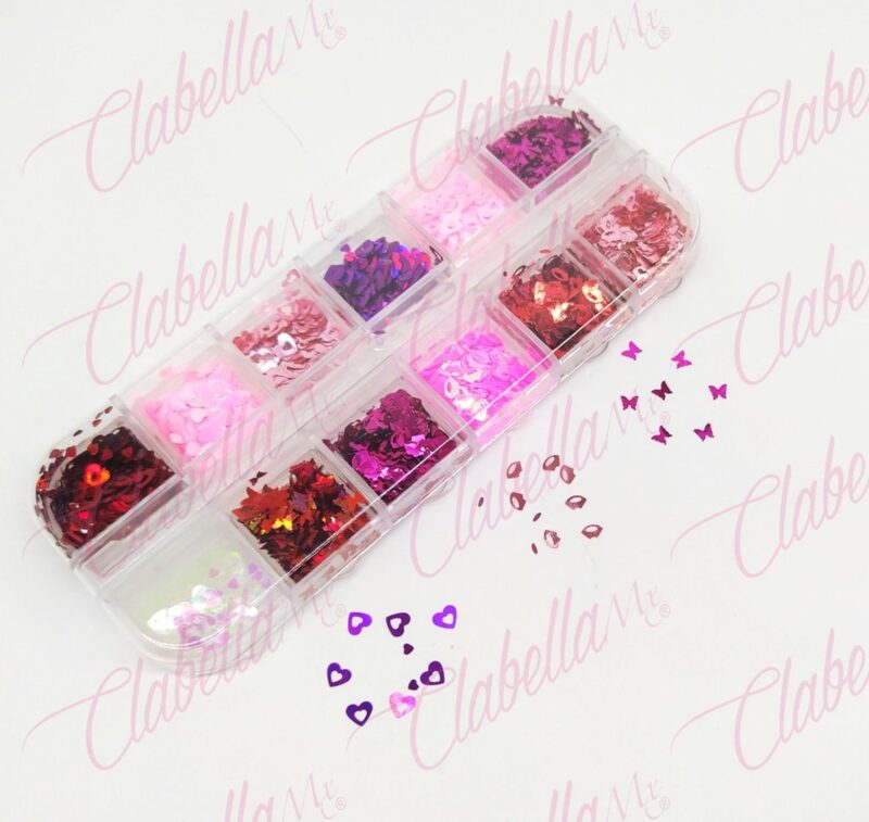 Decoración BESOS Y MARIPOSAS  puede llegar a traer corazones San Valentín para uñas  en pastillero - estuche de 13x5cm con 12 divisiones y tapa individual, surtido