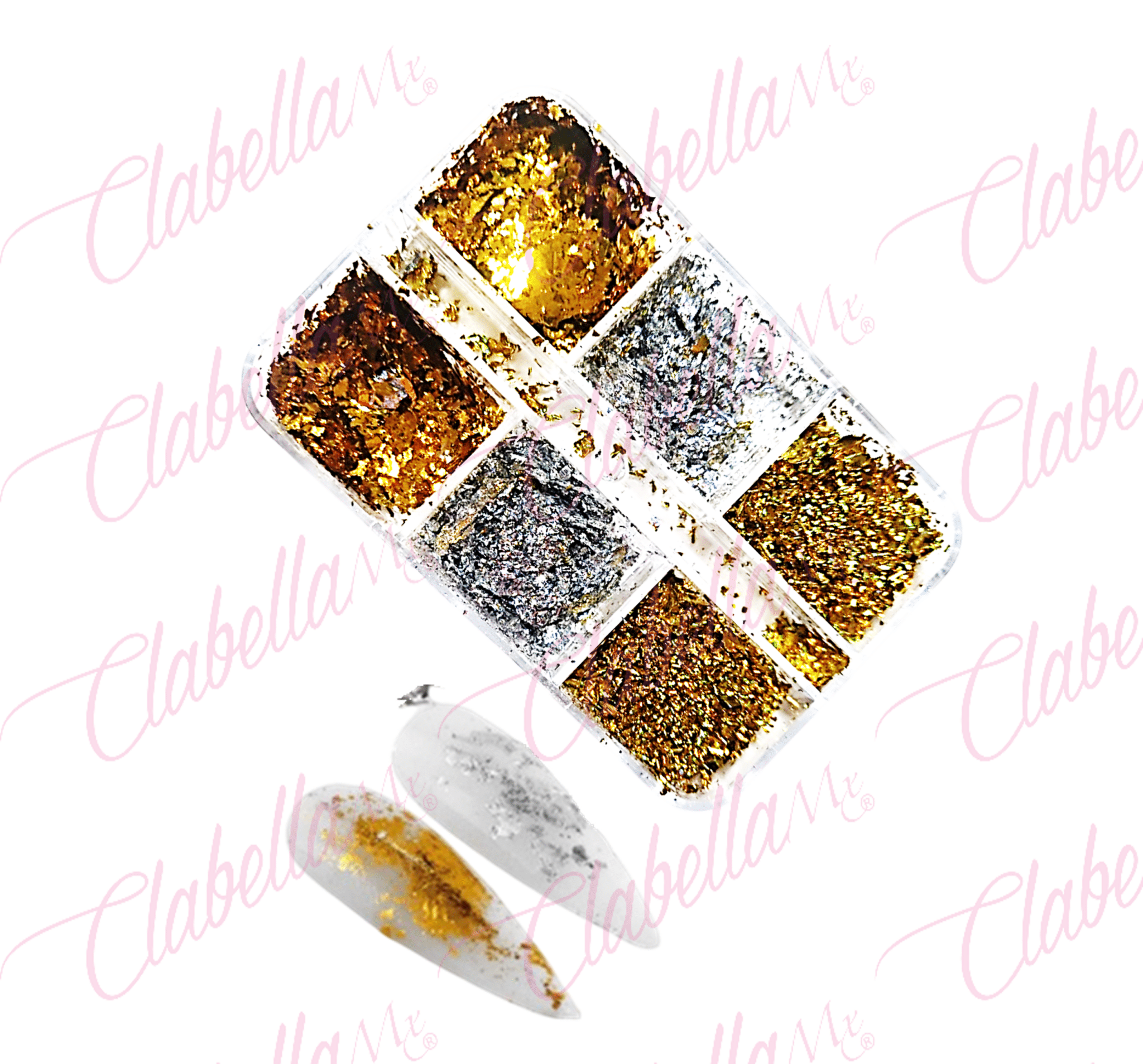 Decoración papel metálico tipo flake oro y plata, para uñas en estuche con 6 divisiones por pieza